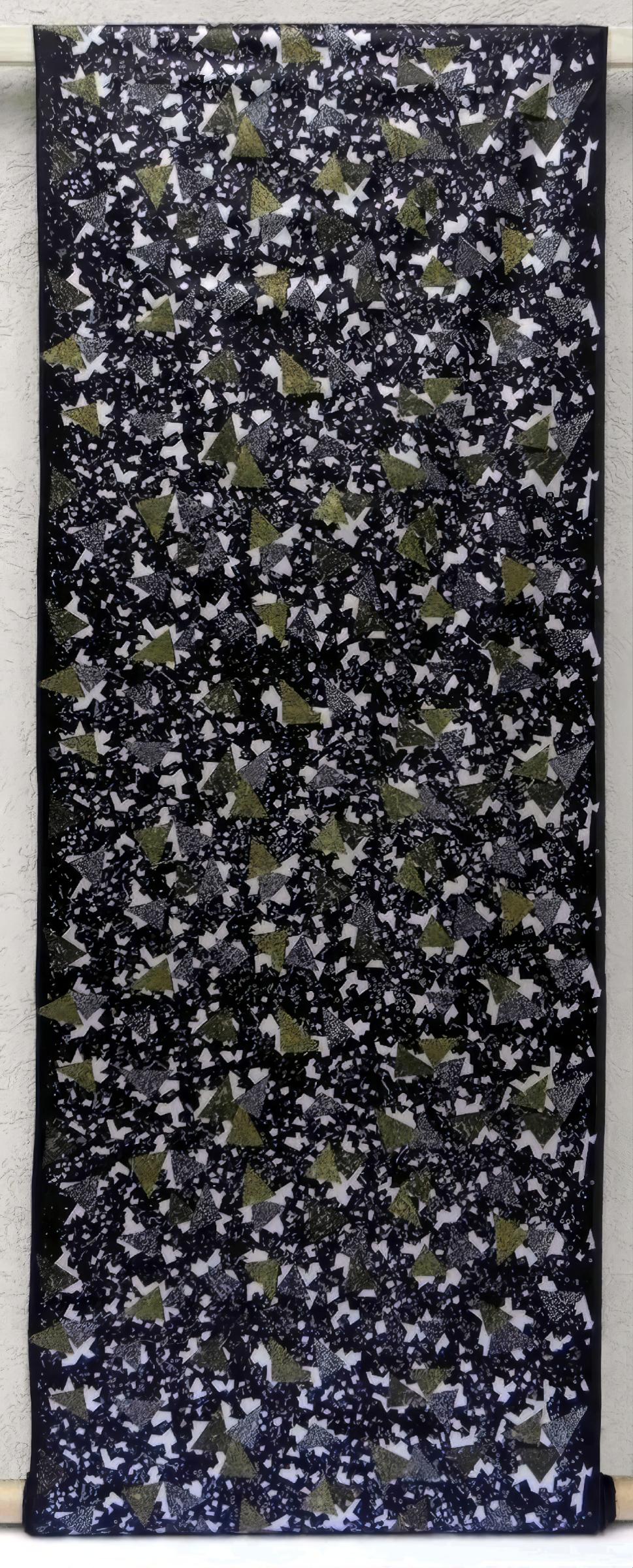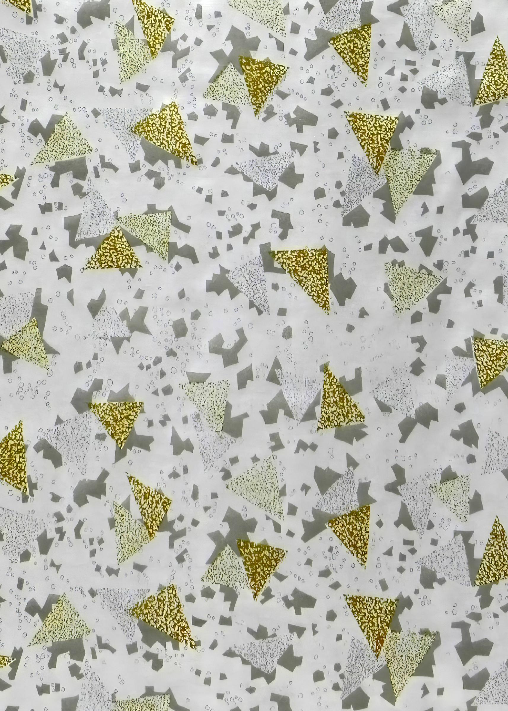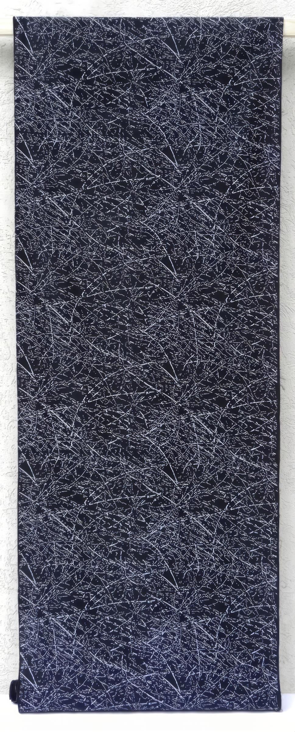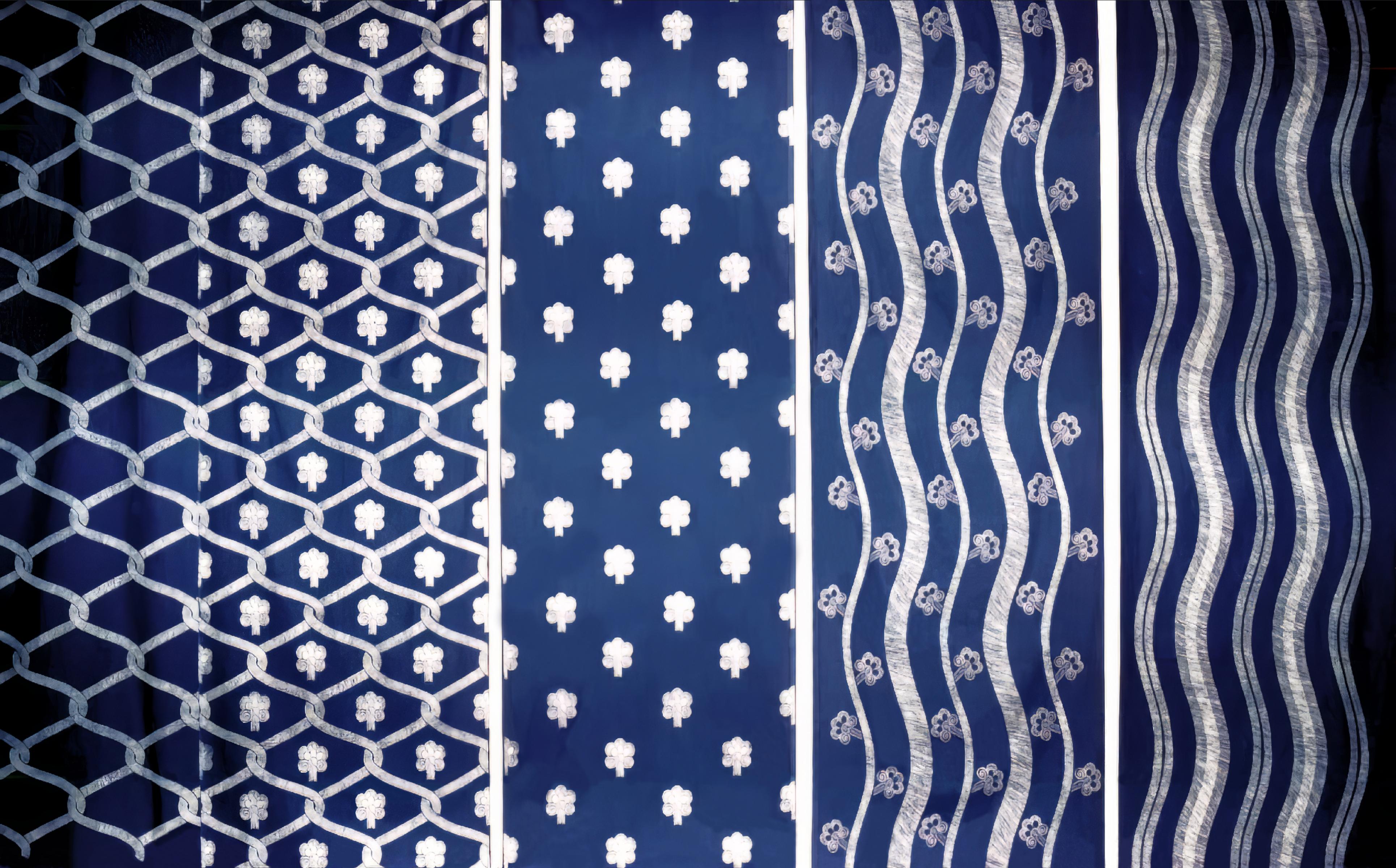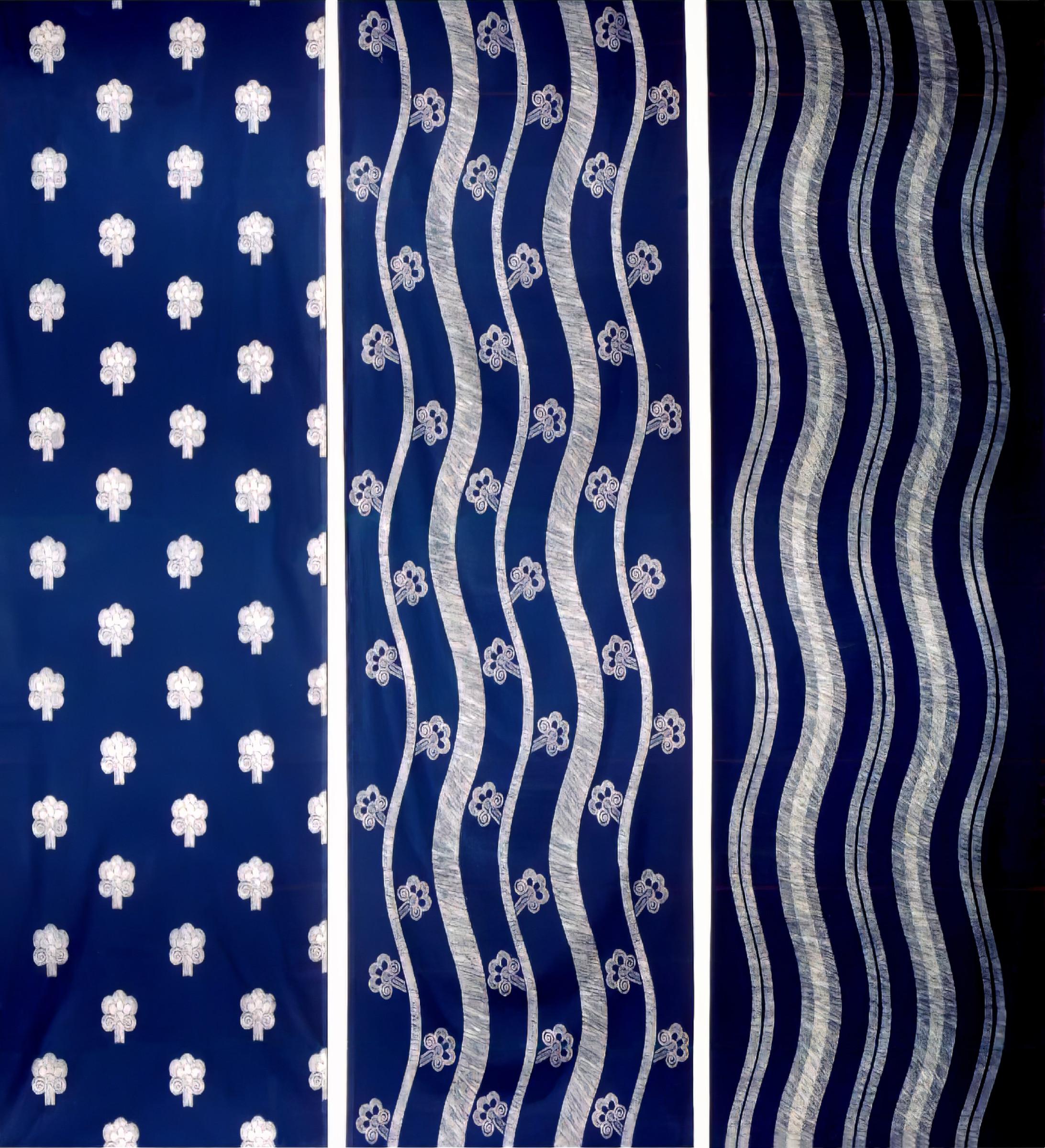 Foglalkoztam a magyar népi hagyományok és múltunk formakincseinek feldolgozásával, átírásával, újraértelmezésének lehetőségeivel. Kékfestő technikával előállított anyagra honfoglaláskori tarsolylemezek motívumvilágából terveztem a folyamatos mintákat.