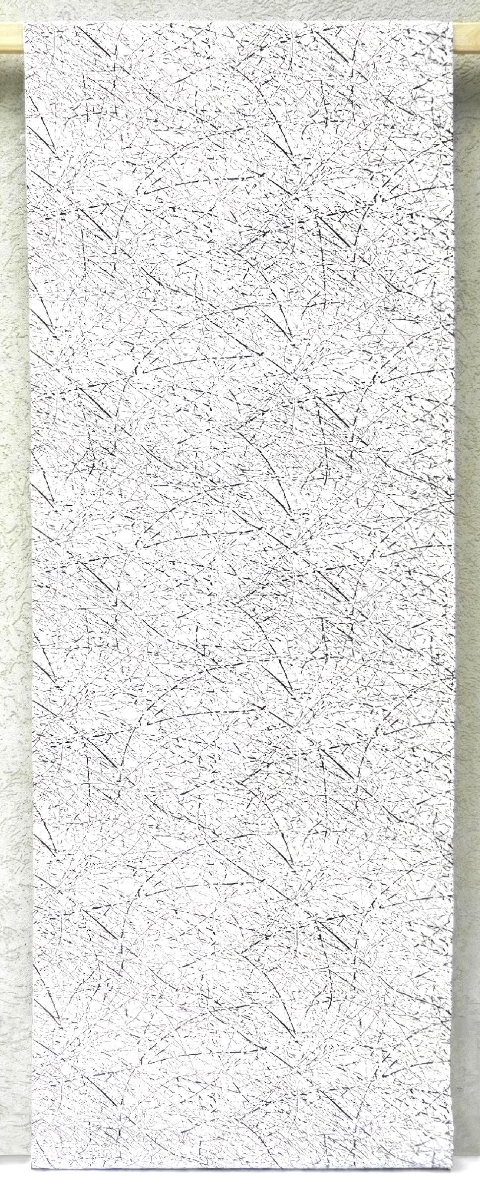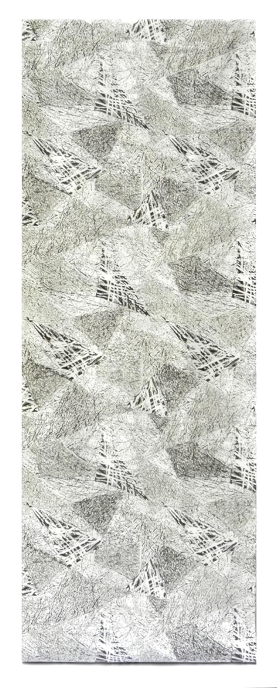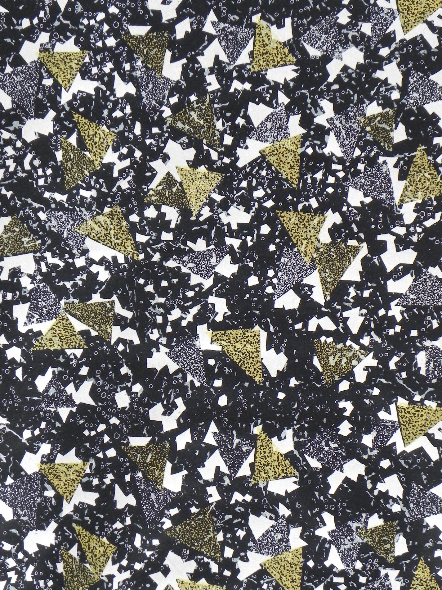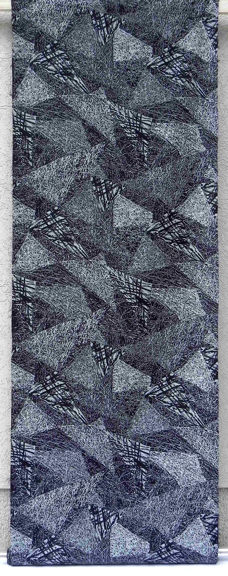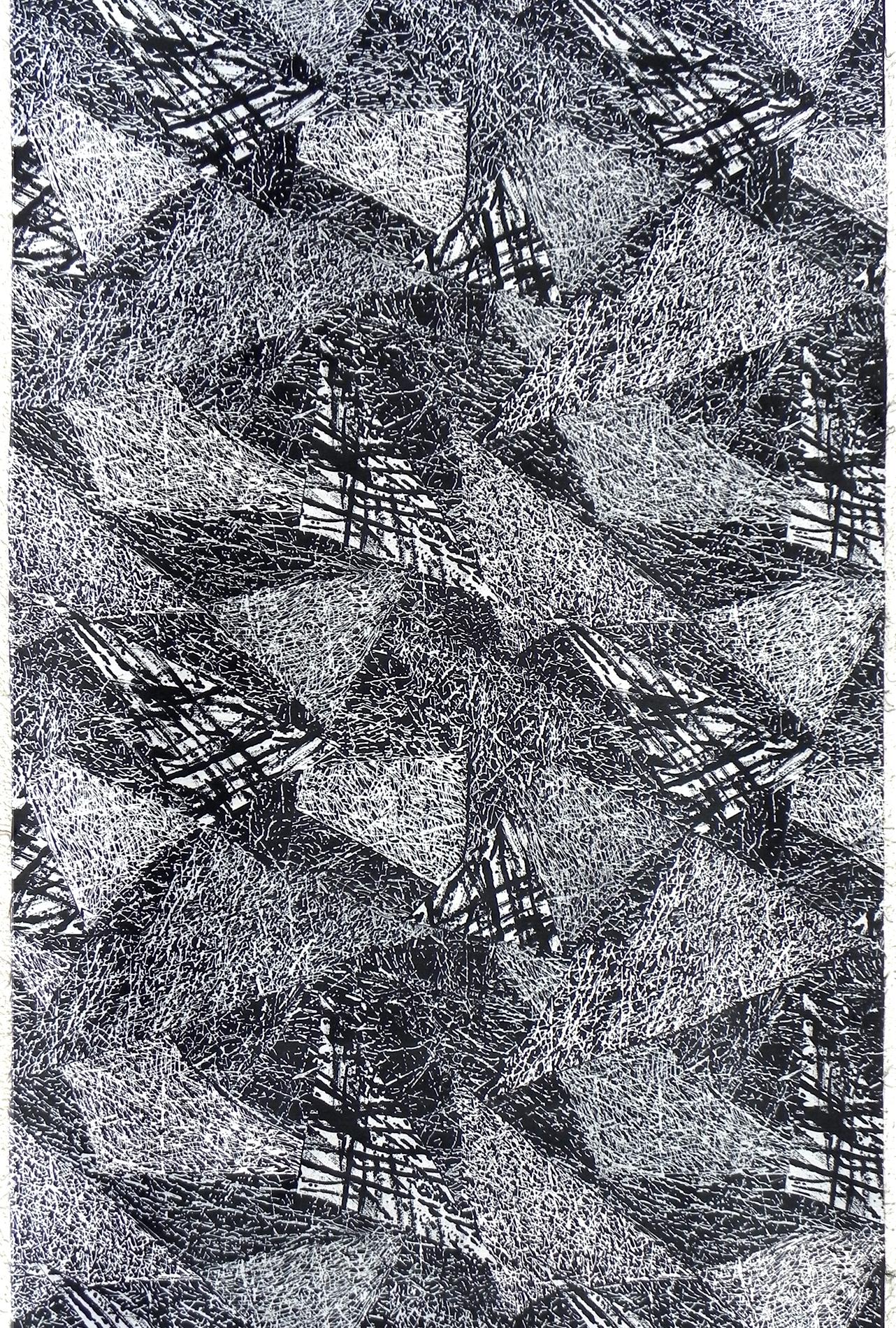 Foglalkoztam a magyar népi hagyományok és múltunk formakincseinek feldolgozásával, átírásával, újraértelmezésének lehetőségeivel. Kékfestő technikával előállított anyagra honfoglaláskori tarsolylemezek motívumvilágából terveztem a folyamatos mintákat.
