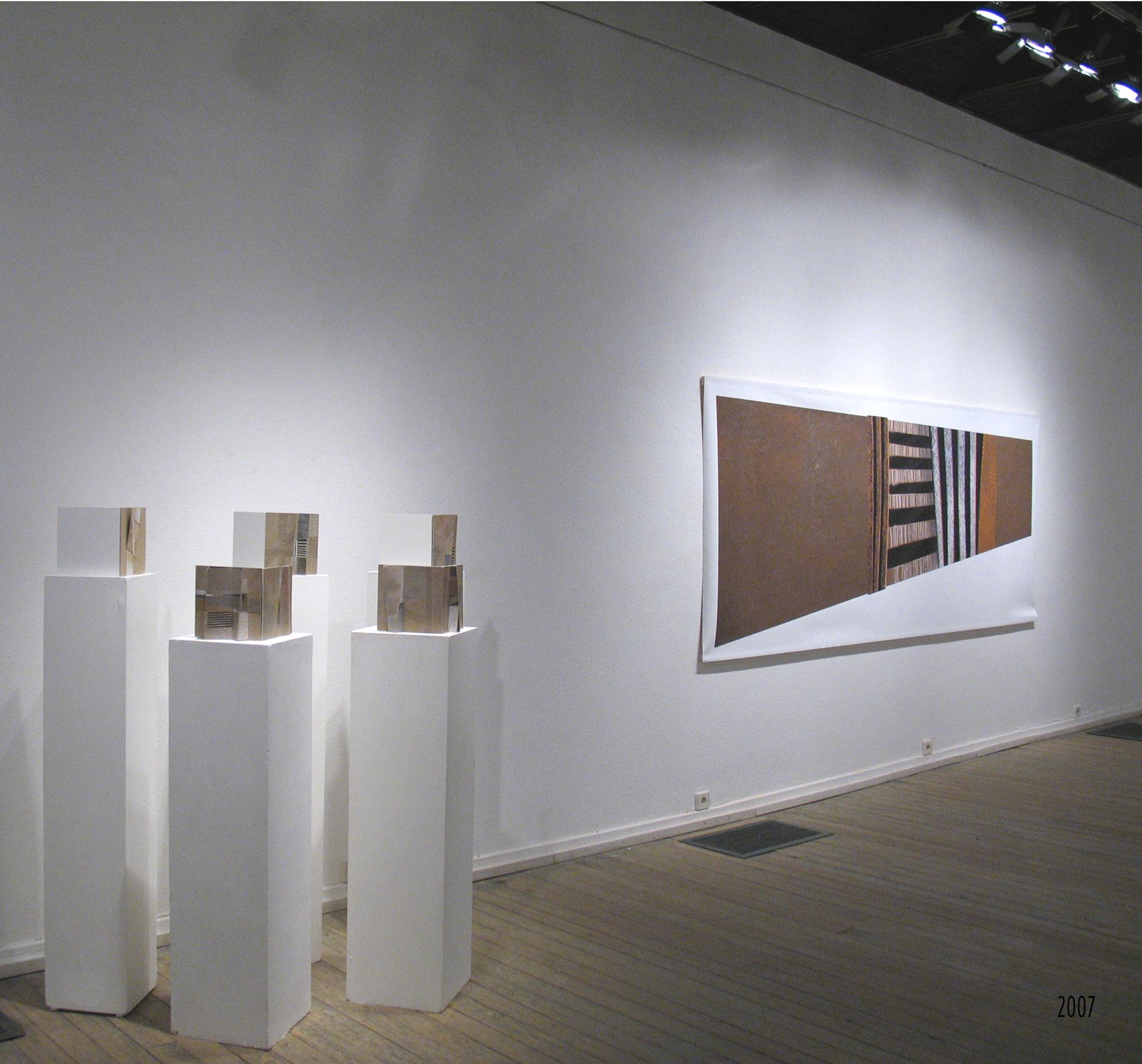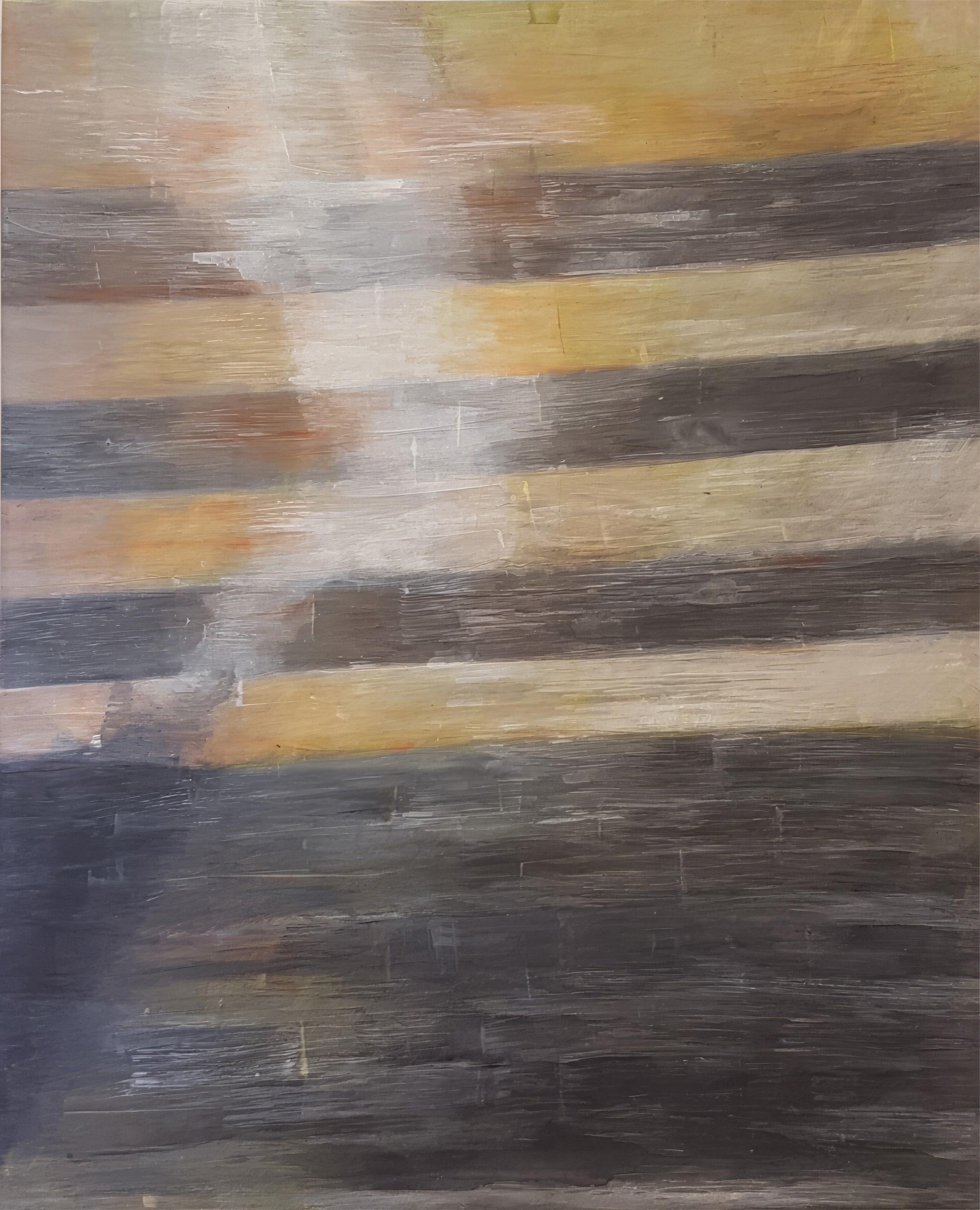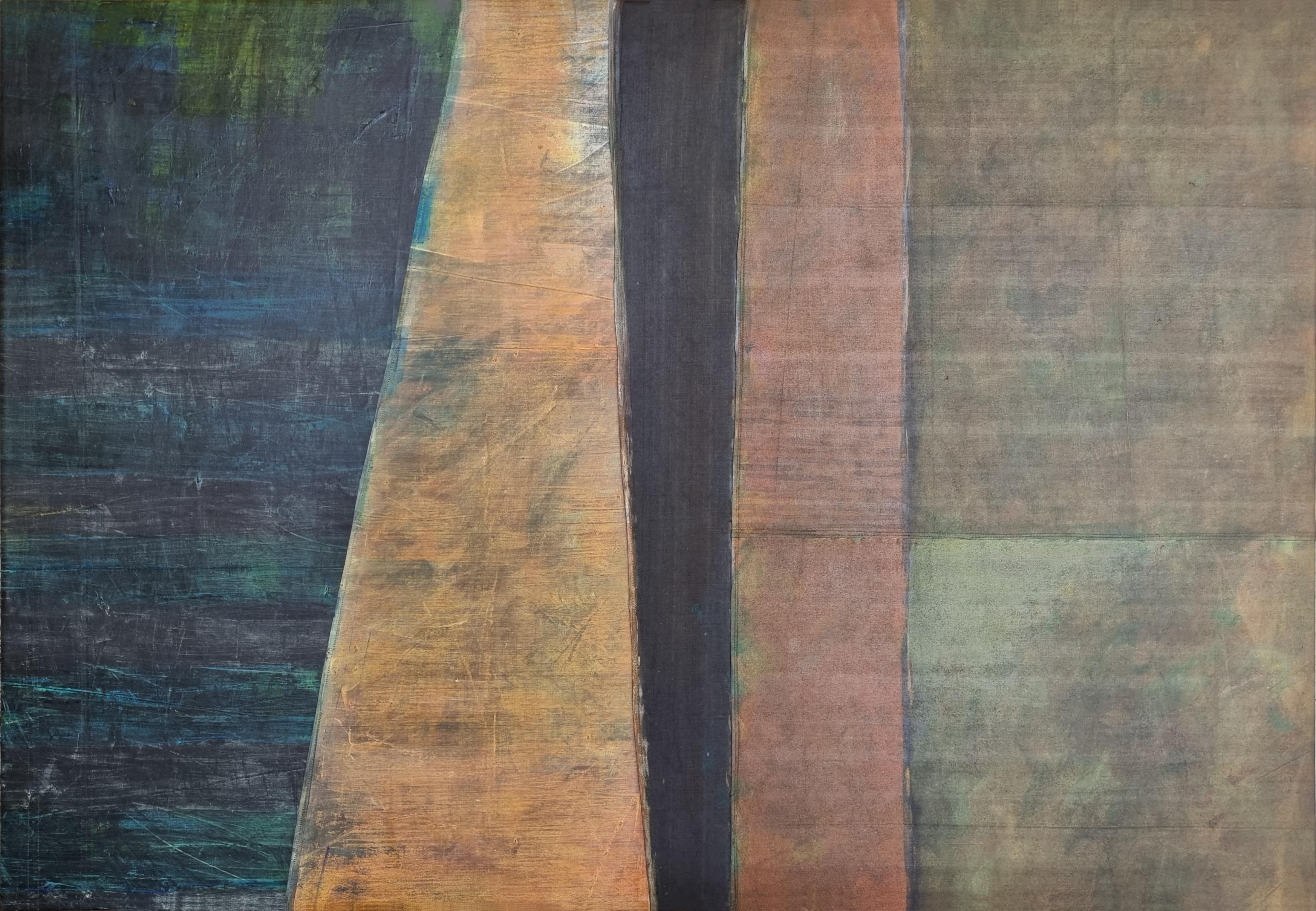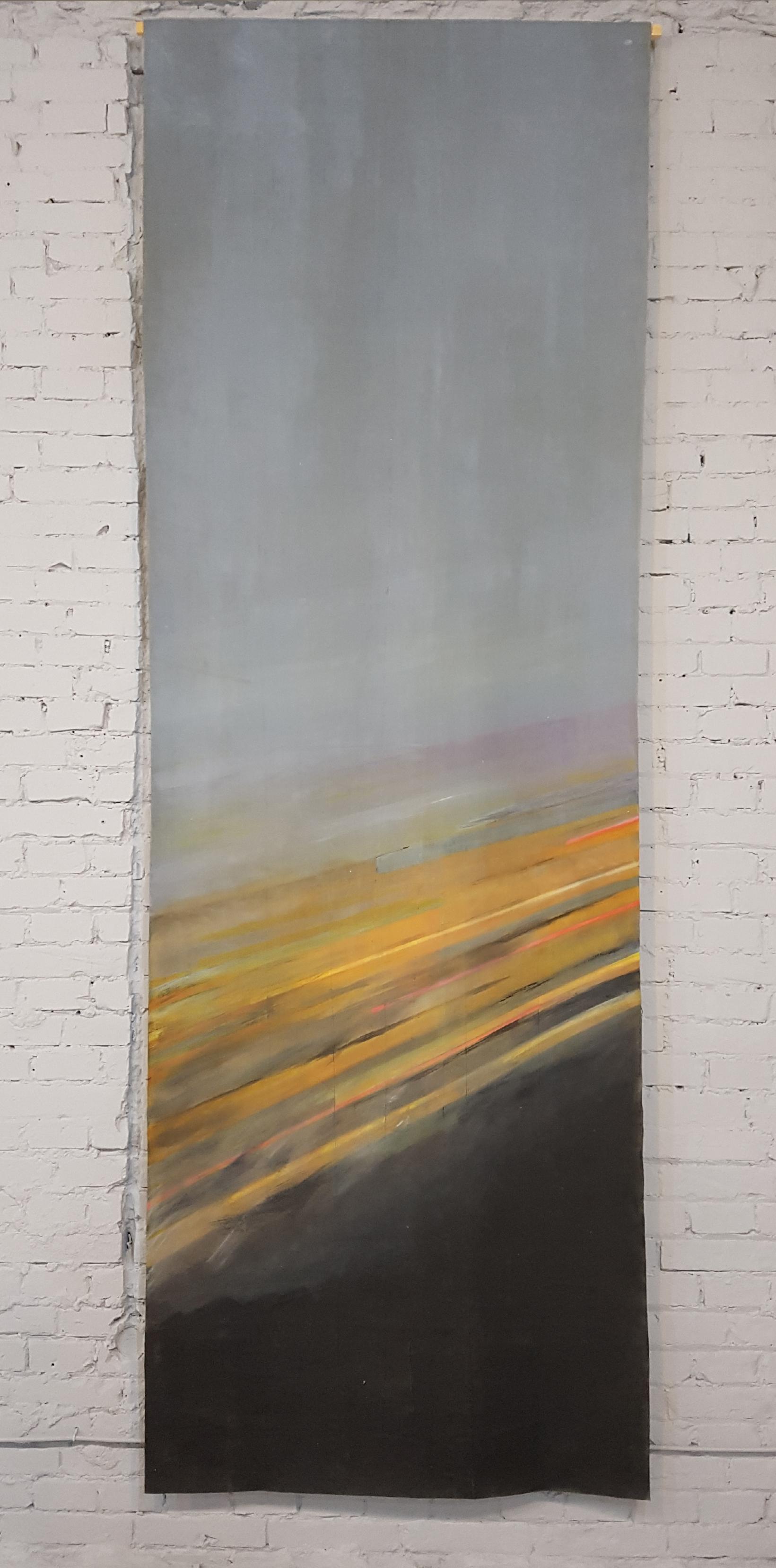 Nagyméretű, selyemre festett munkáimhoz egyedi kialakítású kereteket használtam. A KIJÁRAT1’ és KIJÁRAT2 három, illetve két elemből áll; az ÉJSZAKAI UTAZÁS című képem a Debreceni MODEM Panoráma kiállítására készült, hat elemből áll, 5,35 méter széles és 2,7 méter magas. Régóta foglalkoztat az utazás mint téma: az út, a természetben és a tájban való elmozdulás, valamint az utazás élményének a valóságon túlmutató értelmezése. Legújabb feszített képeimen a festett felületet kisebb-nagyobb bordázással gazdagítom.