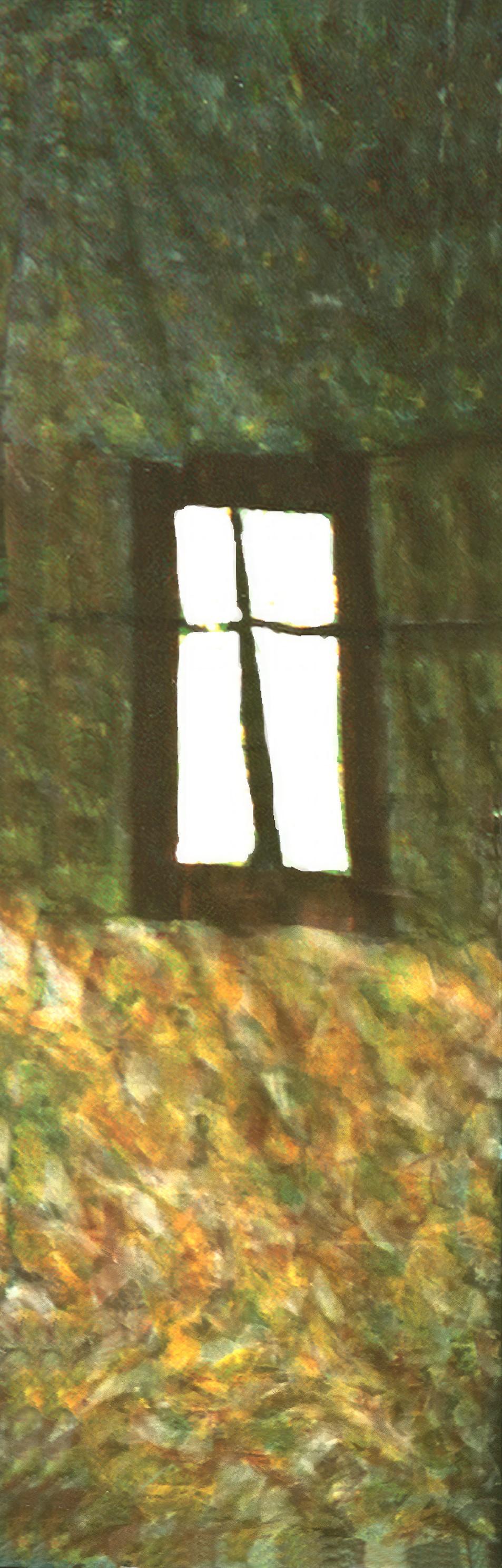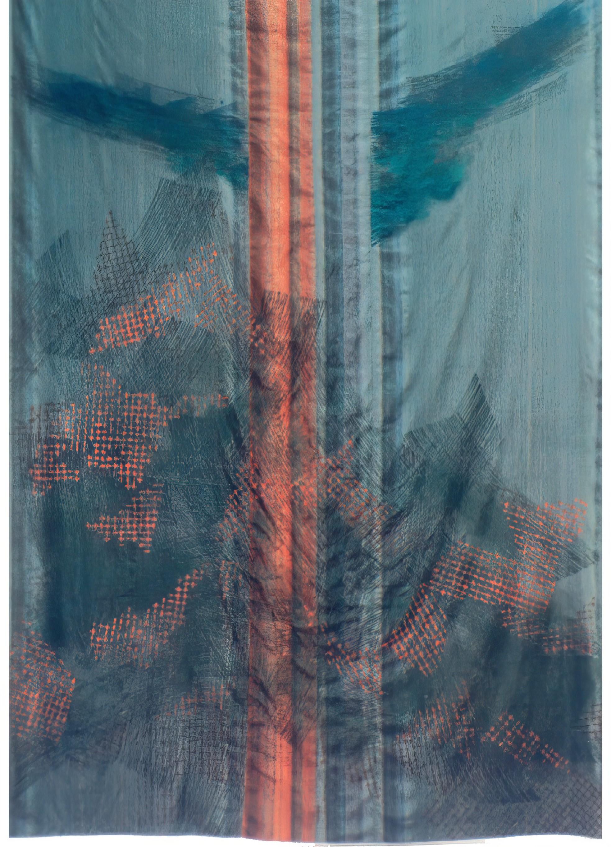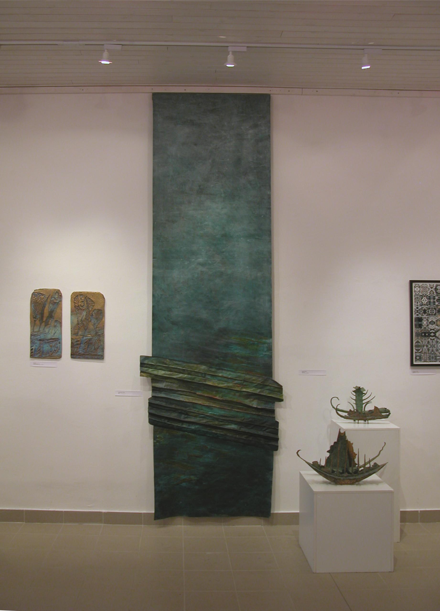 Már a korai festett textilképeken is kísérleteztem a síkból való kimozdulás lehetőségével: gyűrést, hajtogatást, tűzést és rávarrást alkalmaztam a plasztikus hatás érdekében. A szabadvásznas festményeken egy-egy élmény, emlékkép vagy gondolat hangulatát, érzetét próbálom megragadni és rögzíteni a textilfestés speciális technikai lehetőségeivel.